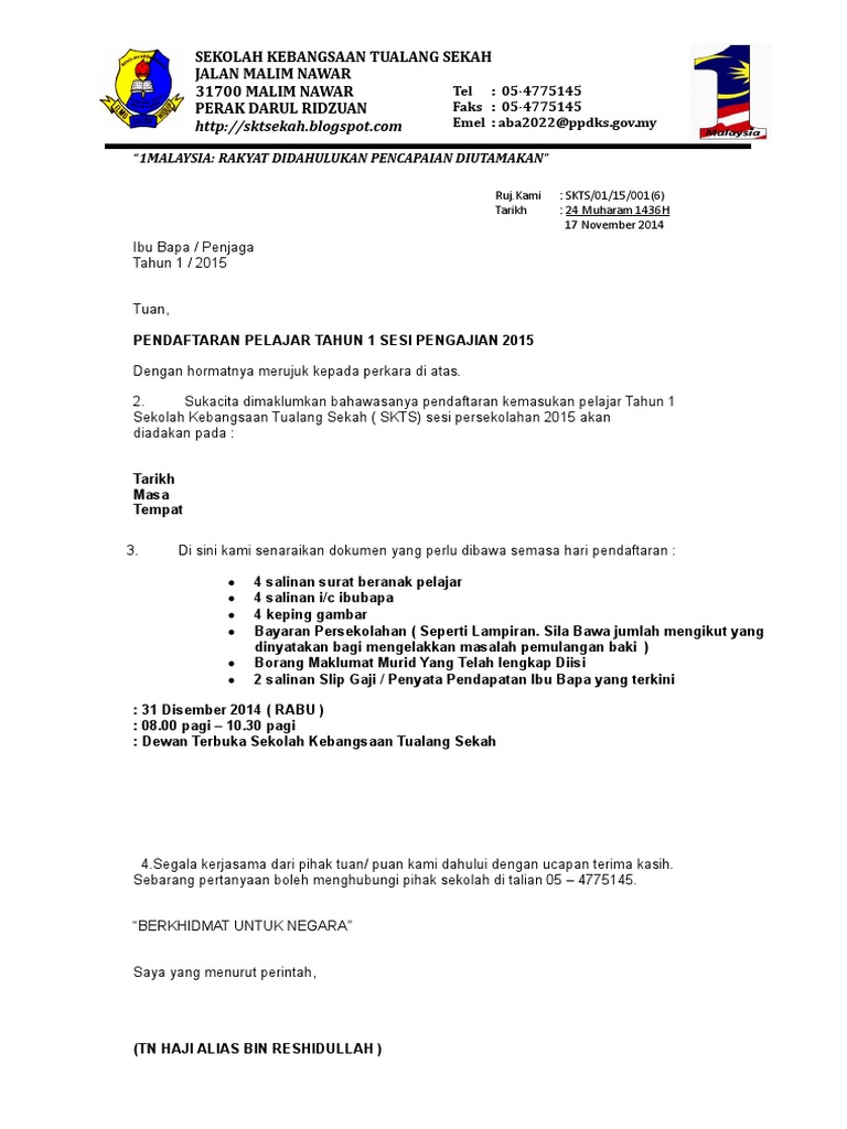 Contoh Surat Makluman Pendaftaran Tahun 1